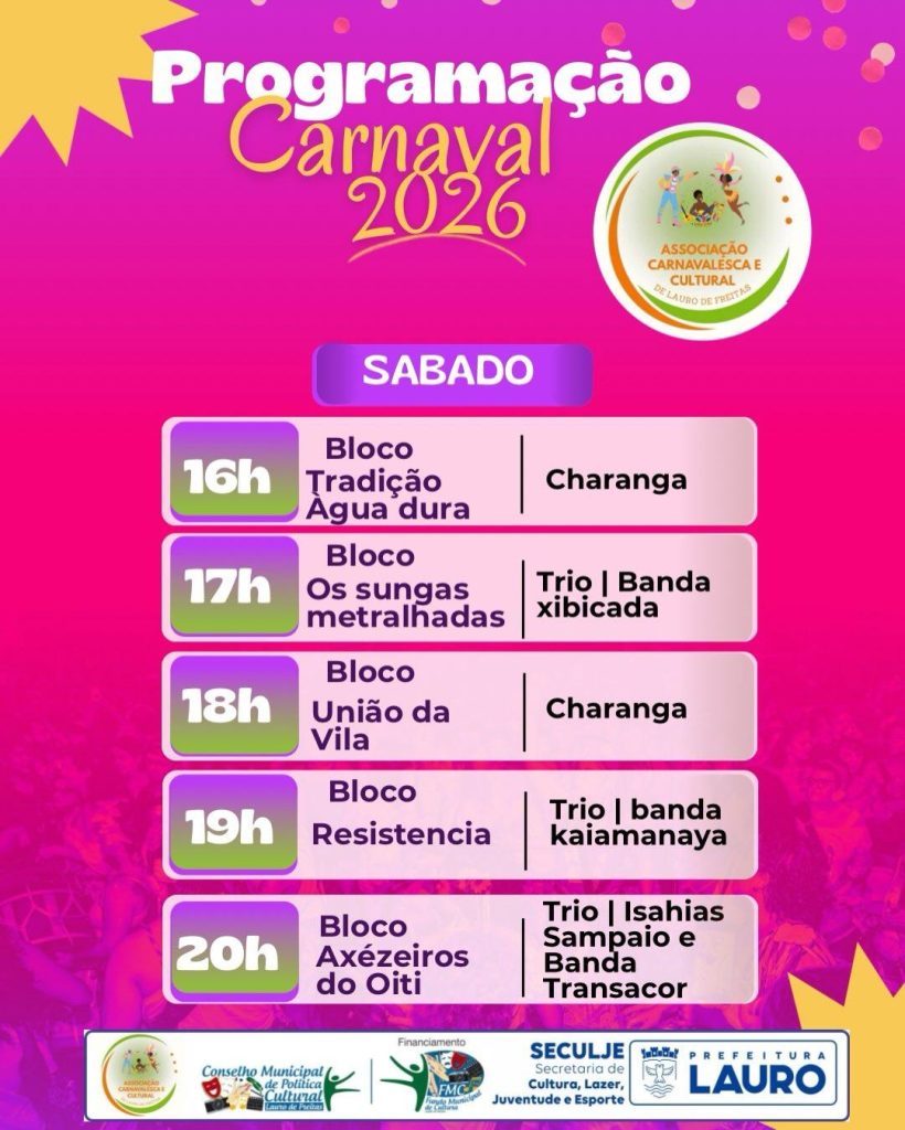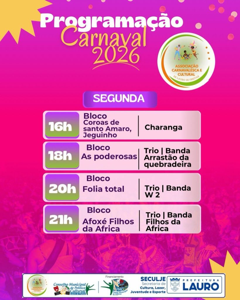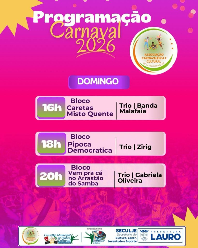 Lauro de Freitas já tem data marcada para a folia. Nos dias 14, 15 e 16 de fevereiro, o Carnaval na Cidade 2026 leva os desfiles de blocos para o Centro, reunindo tradição, cultura popular e apresentações de bandas locais.